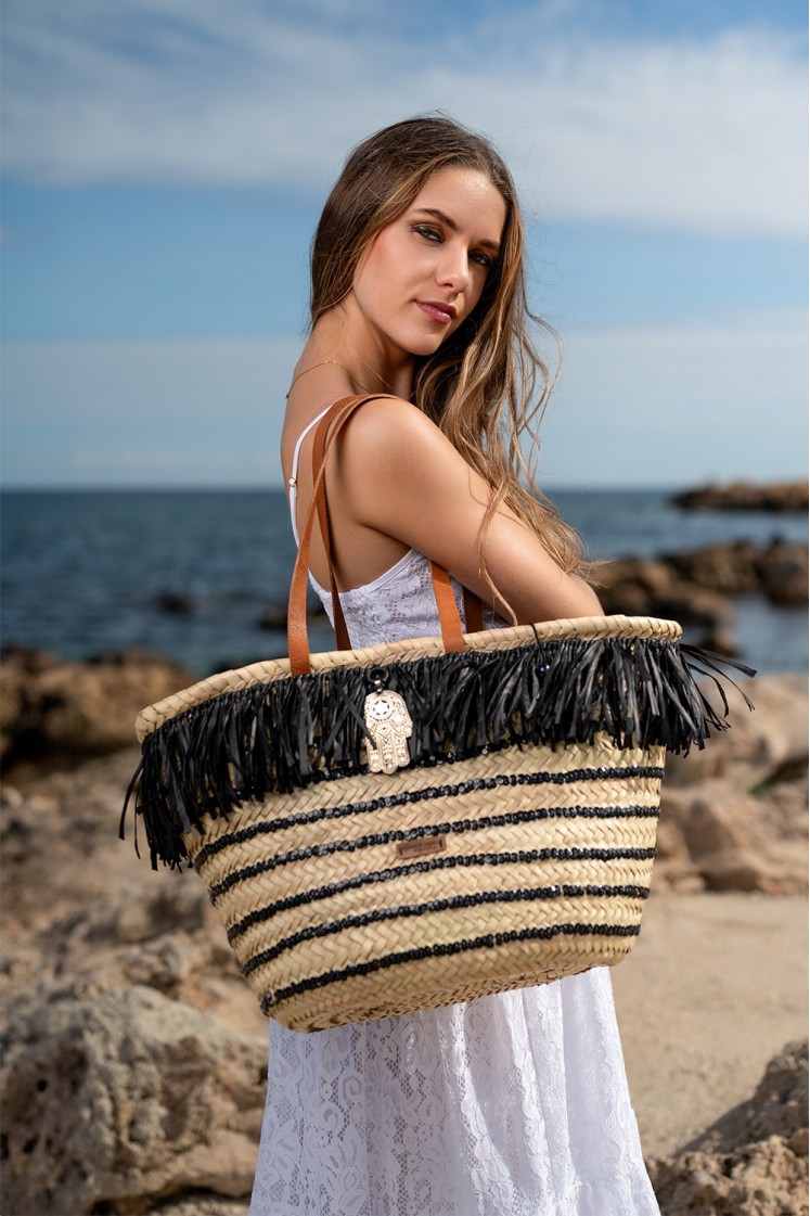 (IMÁN) Capazo de palma bordado con tiras de lentejuelas negras y colgante central “Mano de Fátima”, símbolo protector en las culturas africanas y orientales. Cierre tipo en terciopelo negro. Ideal para playa, compras y eventos diarios.