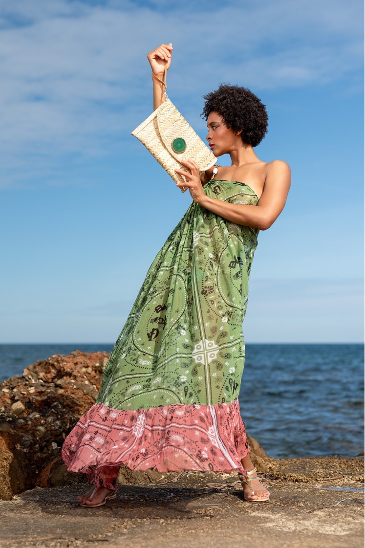 (YING) Elegante cartera de mano de palma con asa de cuero, decorada con una preciosa ágata en verde. Una autentica joya.