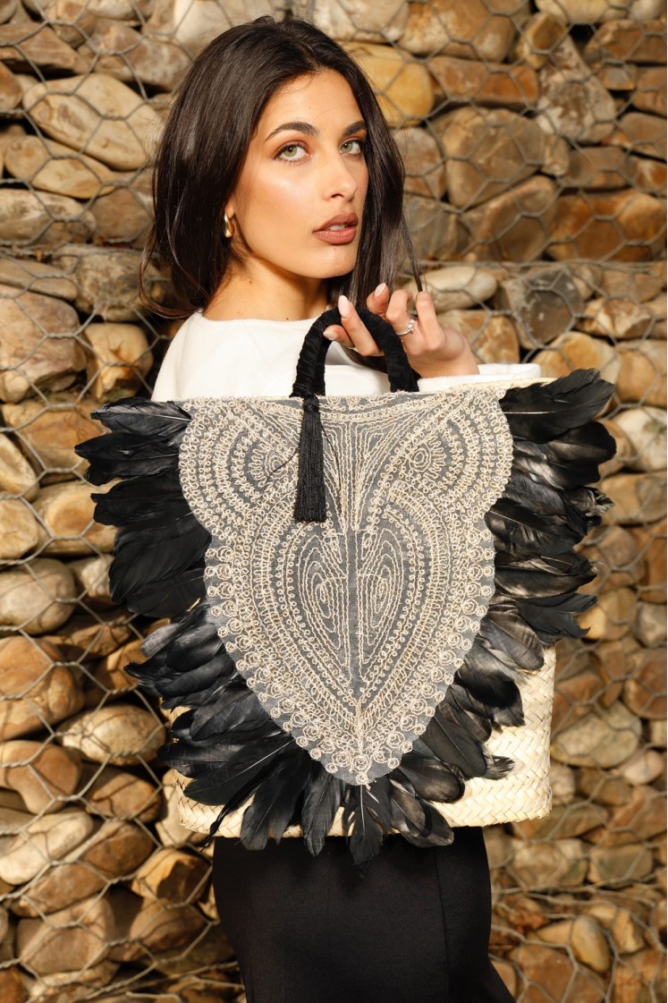 (NAGORE) Elegancia en estado puro. Capazo rectangular de palma de inspiración Otomana, decorado con bordados y plumas en color negro. Una belleza singular. Un complemento perfecto digno de una Diosa.