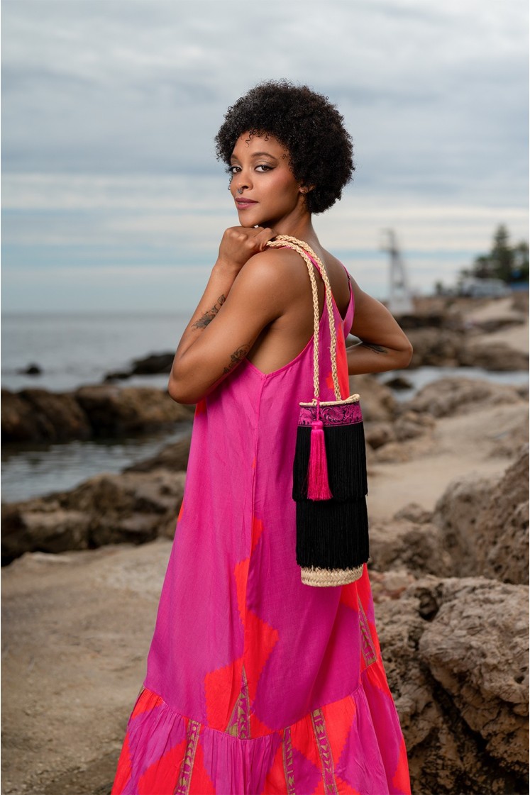 (THAI) Clutch de palma circular ornamentado con doble tira de flecos en negro y pasamanería con motivos Thai. Una pieza de suma elegancia y distinción.