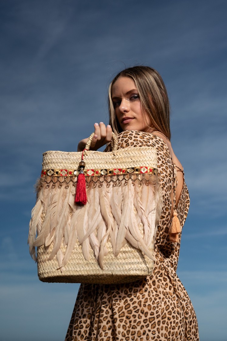 (ISABELLA) Distinción y elegancia. Capazo abierto y rectangular de palma decorado con plumas y pasamanería con cuentas de cristal, cinta de inspiración Indi. Sin duda una pieza que no pasará inadvertida.
