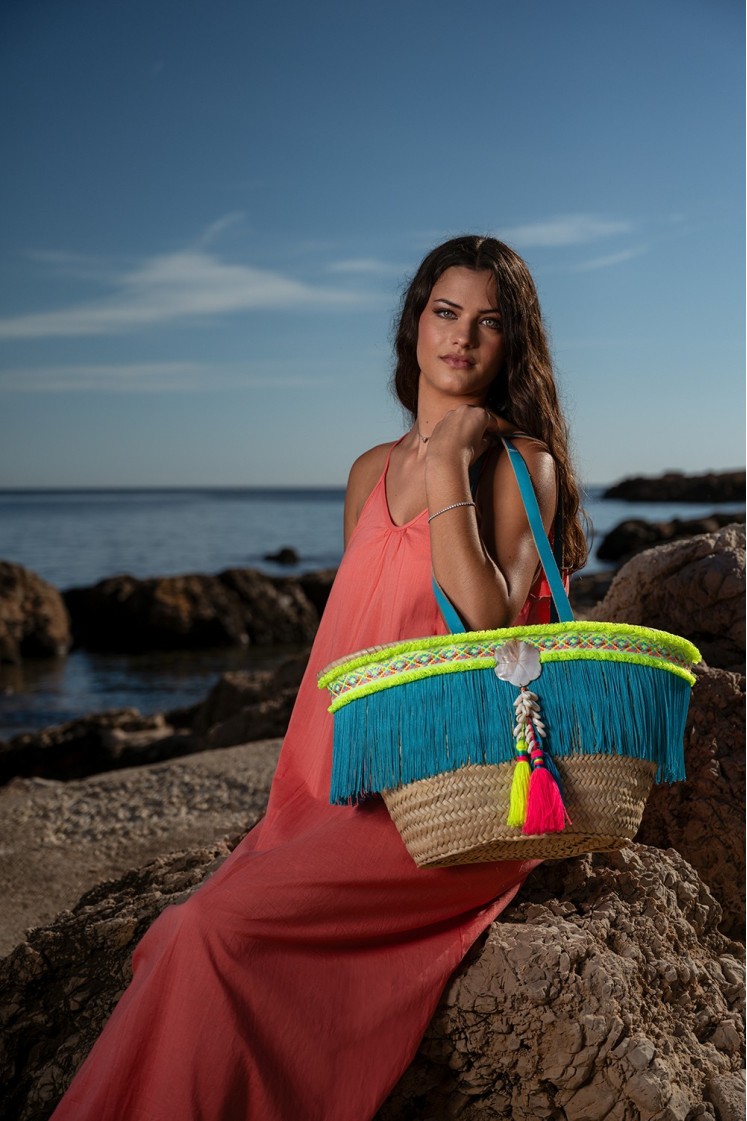 (THELMA) Capazo de palma cerrado con tela en azul y asas de cuero azules, decorado con fleco en tonos azules y pasamanería tejida en tonos fluorescentes, con concha central.