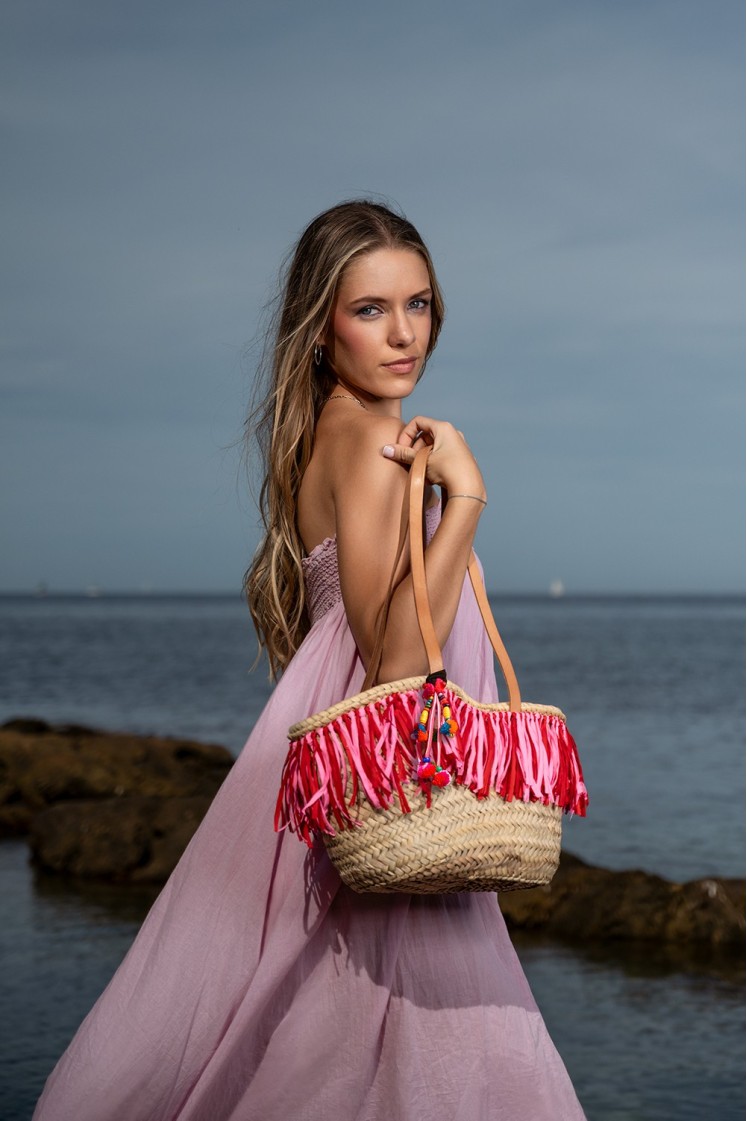 (BONNIE) Capazo de palma cerrado con cremallera, decorado con fleco de rafia bicolor en fucsia y rojo, colgante de pompones coloridos.