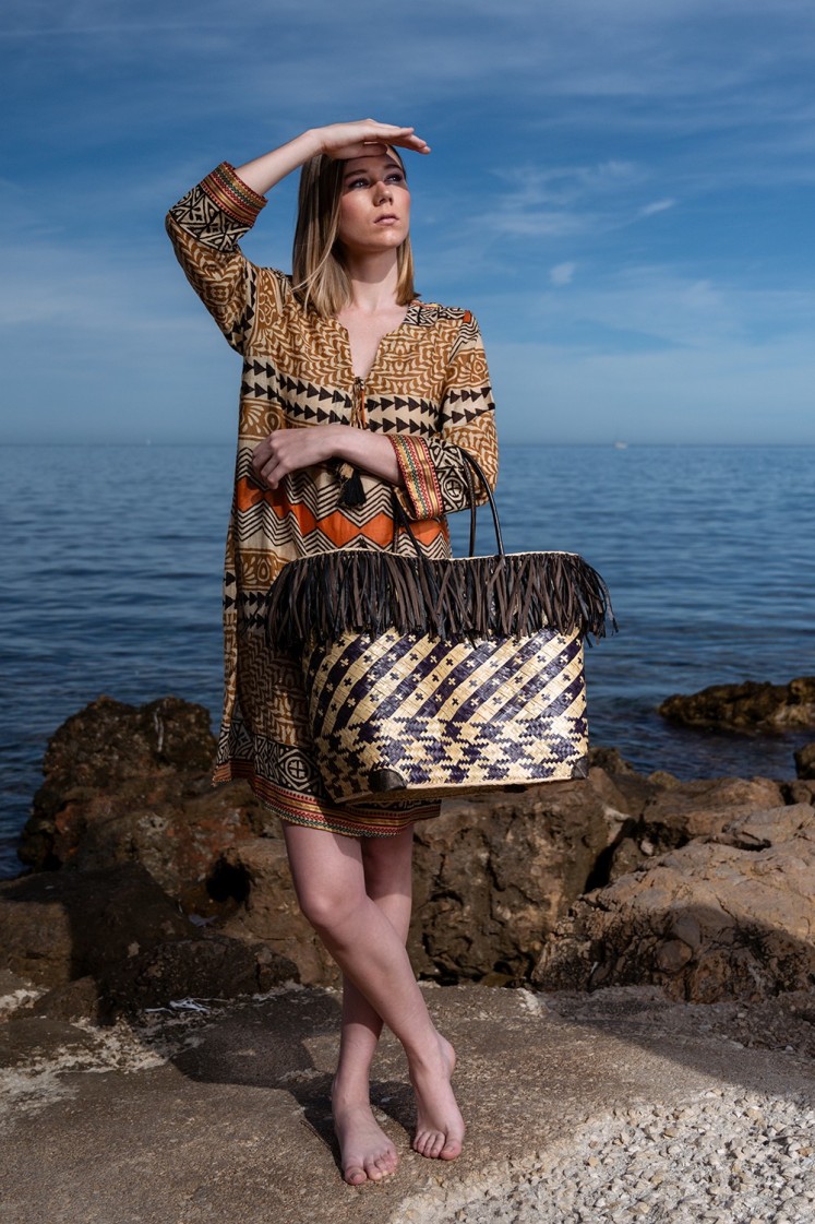 (MAWU) Capazo de palma fina con motivos geométricos, de inspiración africana, cerrado con tela y decorado con tira de fleco bicolor en marrón chocolate y negro.